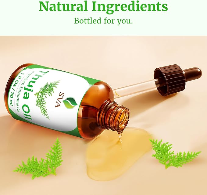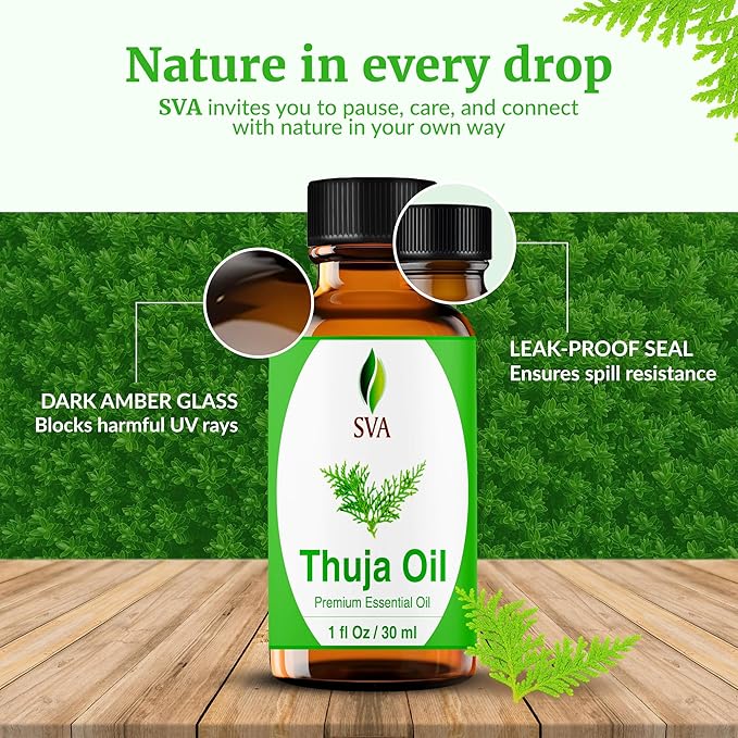 - PREMIUM QUALITY ESSENTIAL OIL: SVA Thuja Essential Oil is obtained by steam distillation of Thuja Orientalis leaves. Our Thuja oil is free of preservatives and comes with a dropper for easy application. It is not tested on Animals. We care for you!