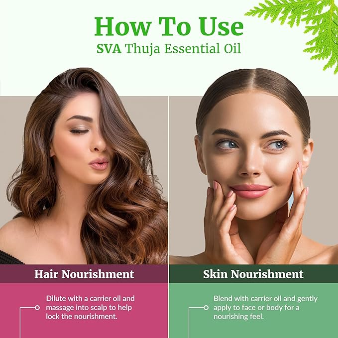 - SKIN NOURISHMENT: SVA Thuja Oil is suitable for use on the skin. It should always be diluted with suitable carrier oil before use since it is highly concentrated. There are many ways to use Thuja essential oil for the skin. Add a few drops of the oil to suitable carrier oil and apply to the affected areas on the skin.