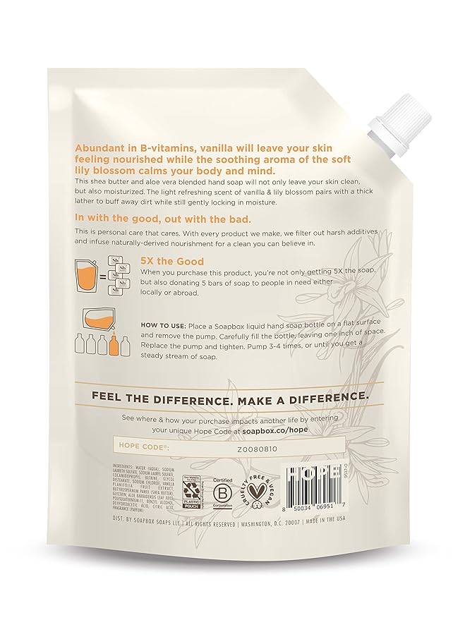 Soapbox Liquid Hand Soap Refill, Vanilla & Lily Blossom, Gentle & Moisturizing Hand Wash for Kitchen and Bathroom, Vegan & Cruelty Free, 64oz Half Gallon Refill (Pack of 1)