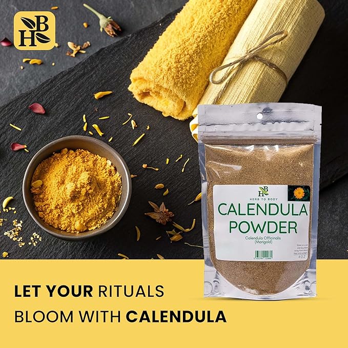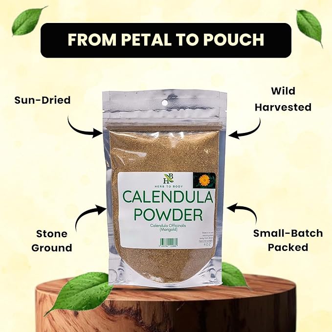 Herb To Body Calendula Powder – 4 oz, Wildcrafted Dried Marigold Flowers Powder for Calendula Tea, Body Care, and Edible Flowers Uses