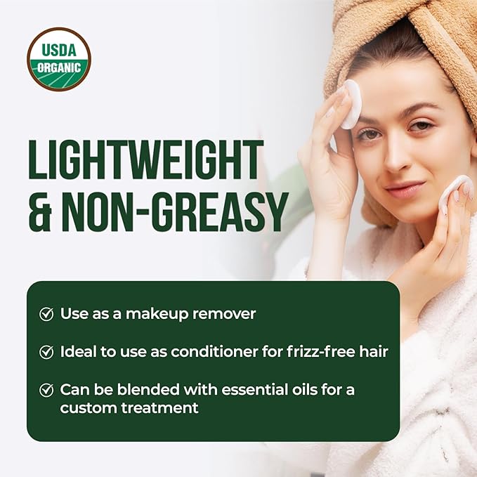 - Lightweight & Non-Greasy Formula – Absorbs quickly without leaving a heavy residue. Ideal for use as a makeup remover, conditioner for smoother-feeling hair, or blended with essential oils for a custom treatment.