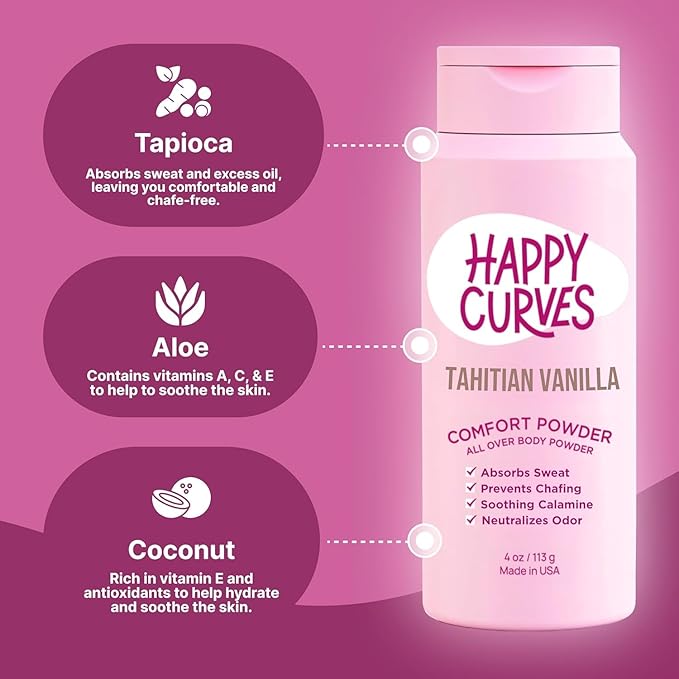 HAPPY CURVES Comfort Powder: Talc Free Anti Chafe Body & Foot Dusting Powder Deodorant for Inner Thigh Chafing, Private Areas, and All Over Body for Women (4 Ounce (Pack of 1), Tahitian Vanilla)