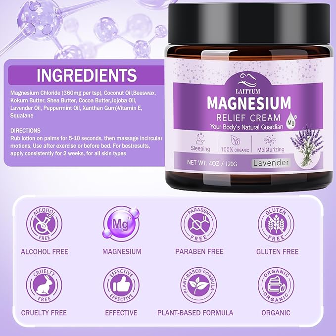 - MULTIPURPOSE - LAITYUM Magnesium lotion is suitable for all occasions: after a long day at work or after a sport or before going to sleep. It helps you support a restful night, promote relaxation muscle fatigue, moisturizing skin. The 3-in-1 lavender magnesium body lotion is also perfect gift for women and man.