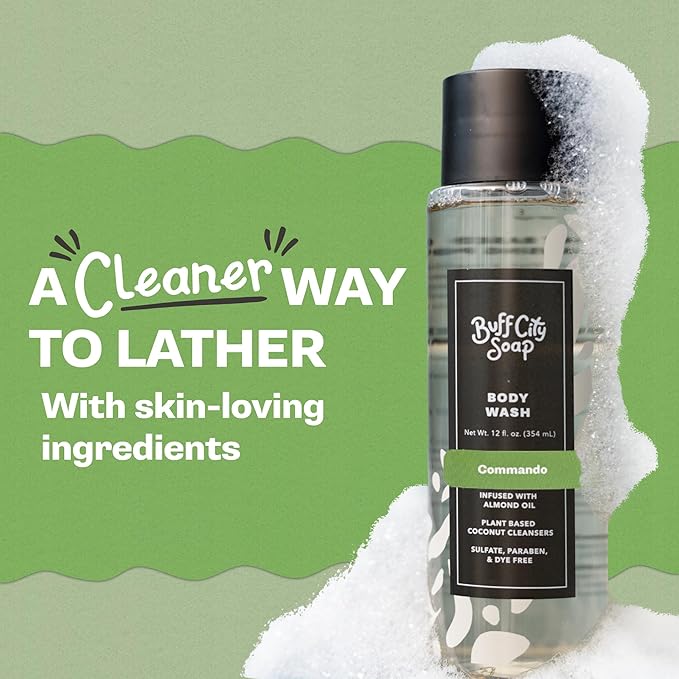 Buff City Soap Plant-Based Body Wash - Gentle Cleansing Body Wash, Coconut Cleansers Infused with Almond Oil, Dermatologist Tested, Rich Lather, Non-Drying for Women and Men - Commando, 12 fl oz