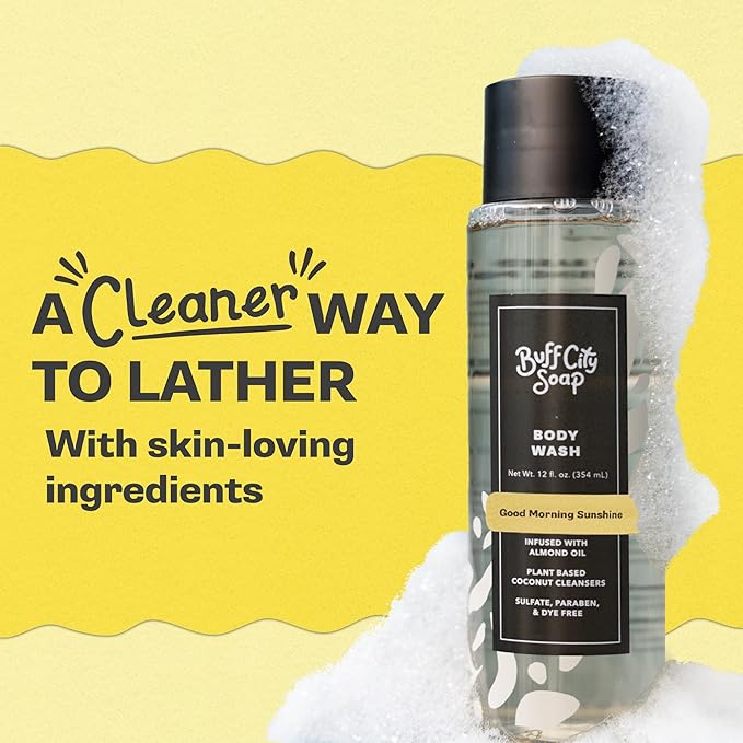 Buff City Soap Plant-Based Body Wash- Coconut Cleansers & Almond Oil Infused, Gentle & Rich Non-Drying Lather, Helps Reduce Moisture Loss & Supports Skin Barrier-Good Morning Sunshine, 12 fl oz